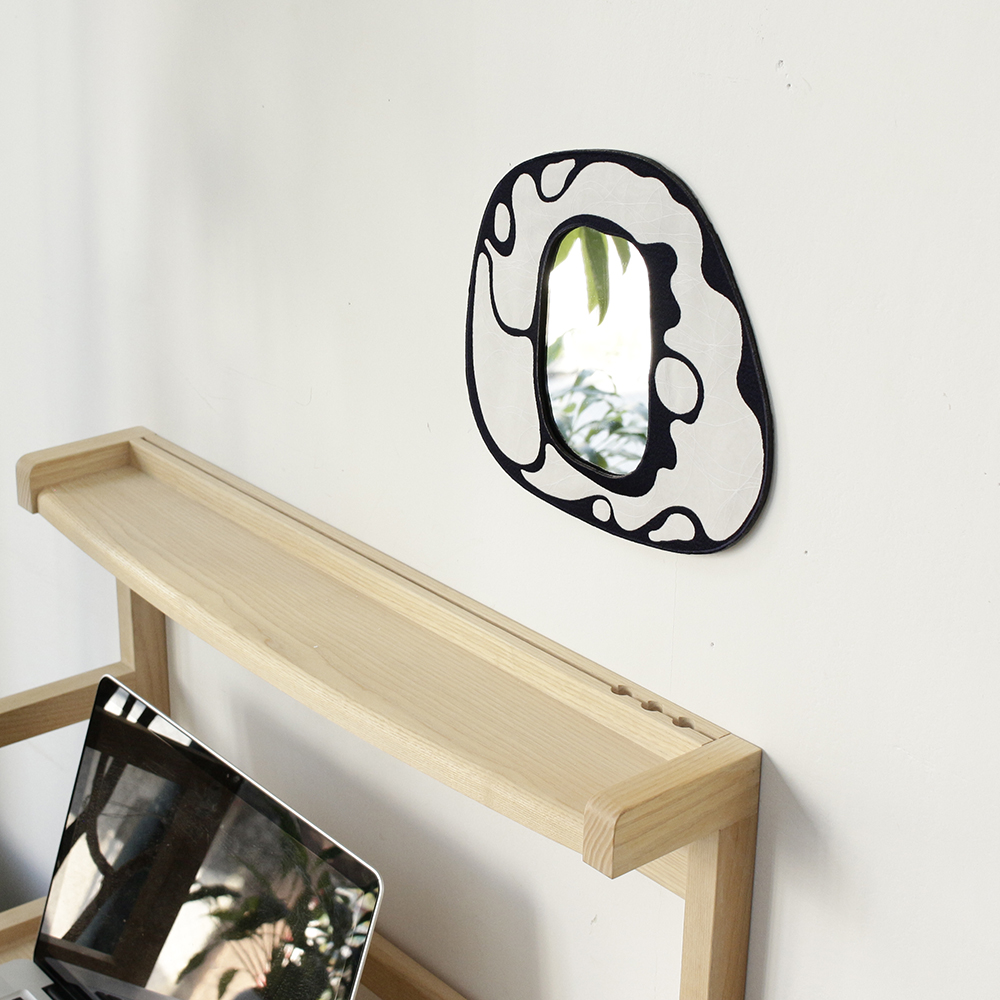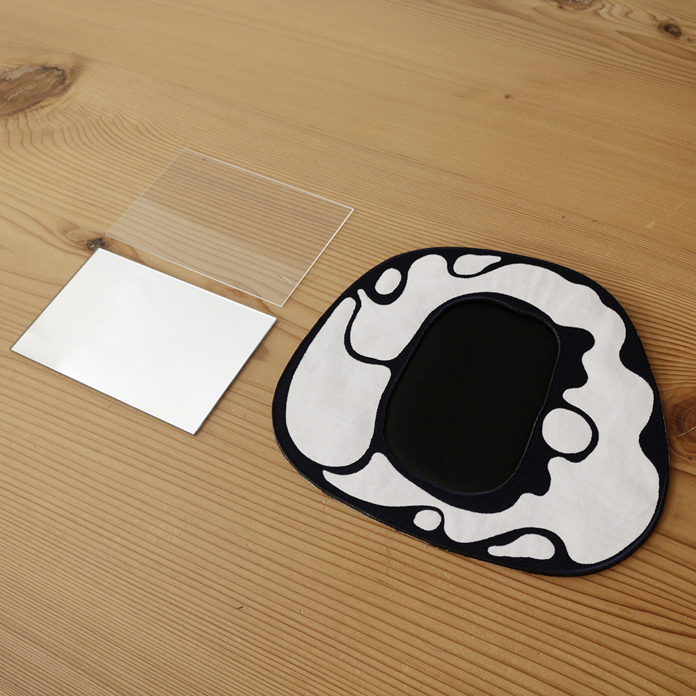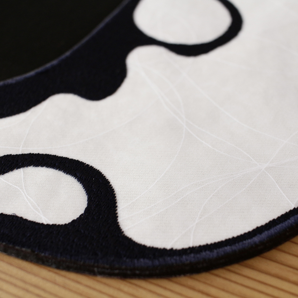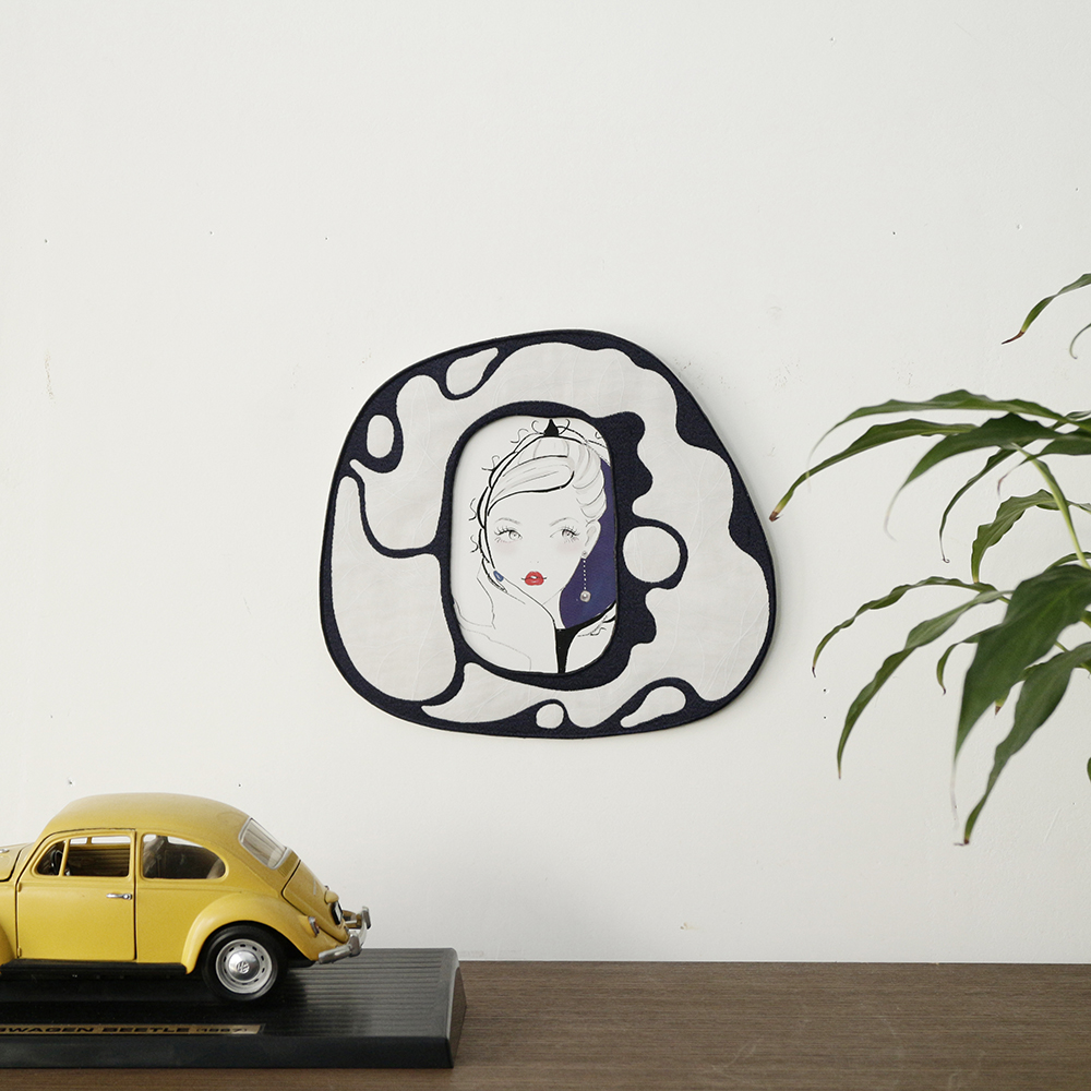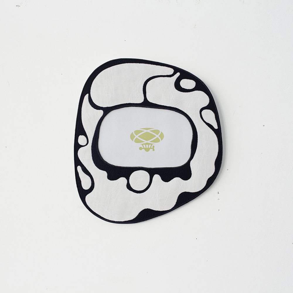 飛行船スタイルのオリジナルミラー「KUMO」のシルエットを、雲が渦巻くイメージで描いていただいた商品です。 四角いフレームではなく、有機的なフォルムをした刺繍フレーム部分が柔らかい雰囲気になり、空間に調和します。